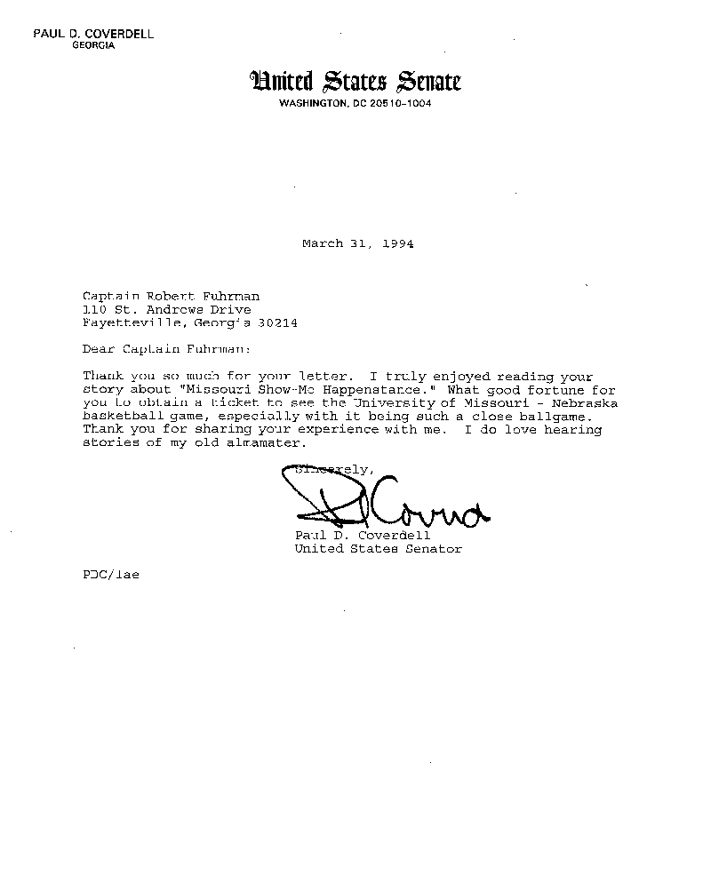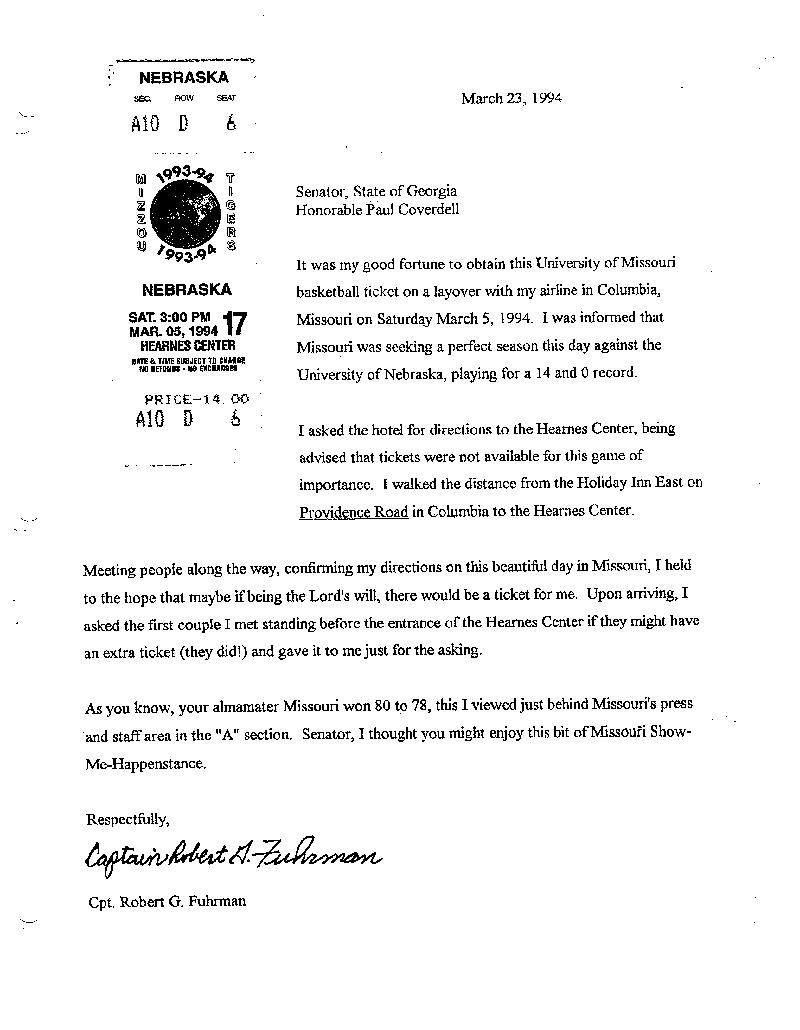 When I returned home, a few days later, I was in a phone conversation with the staff of my United States Senator, the late Paul Coverdell. I related this story to them as part of a general conversation of interest and they informed me that Senator Coverdell was an alumni of the University of Missouri. I wrote Senator Coverdell a letter and a copy of the “when I get there” basketball ticket is copied to this correspondence.